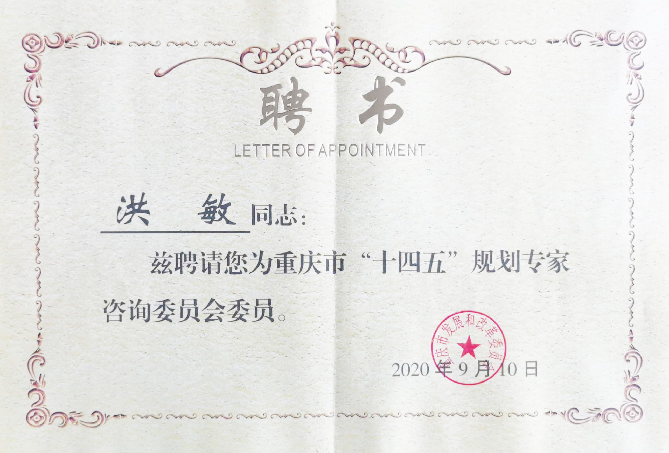 熱烈祝賀集團(tuán)董事長(zhǎng)洪敏 獲聘重慶市“十四五”規(guī)劃專家咨詢委員會(huì)委員